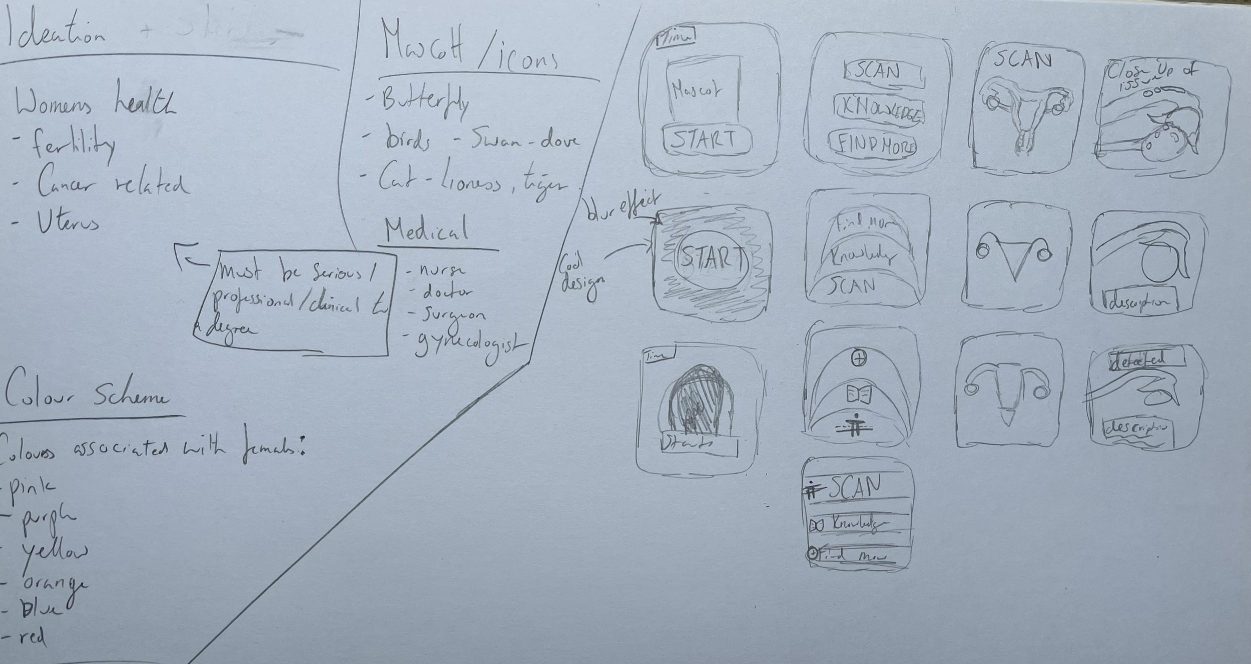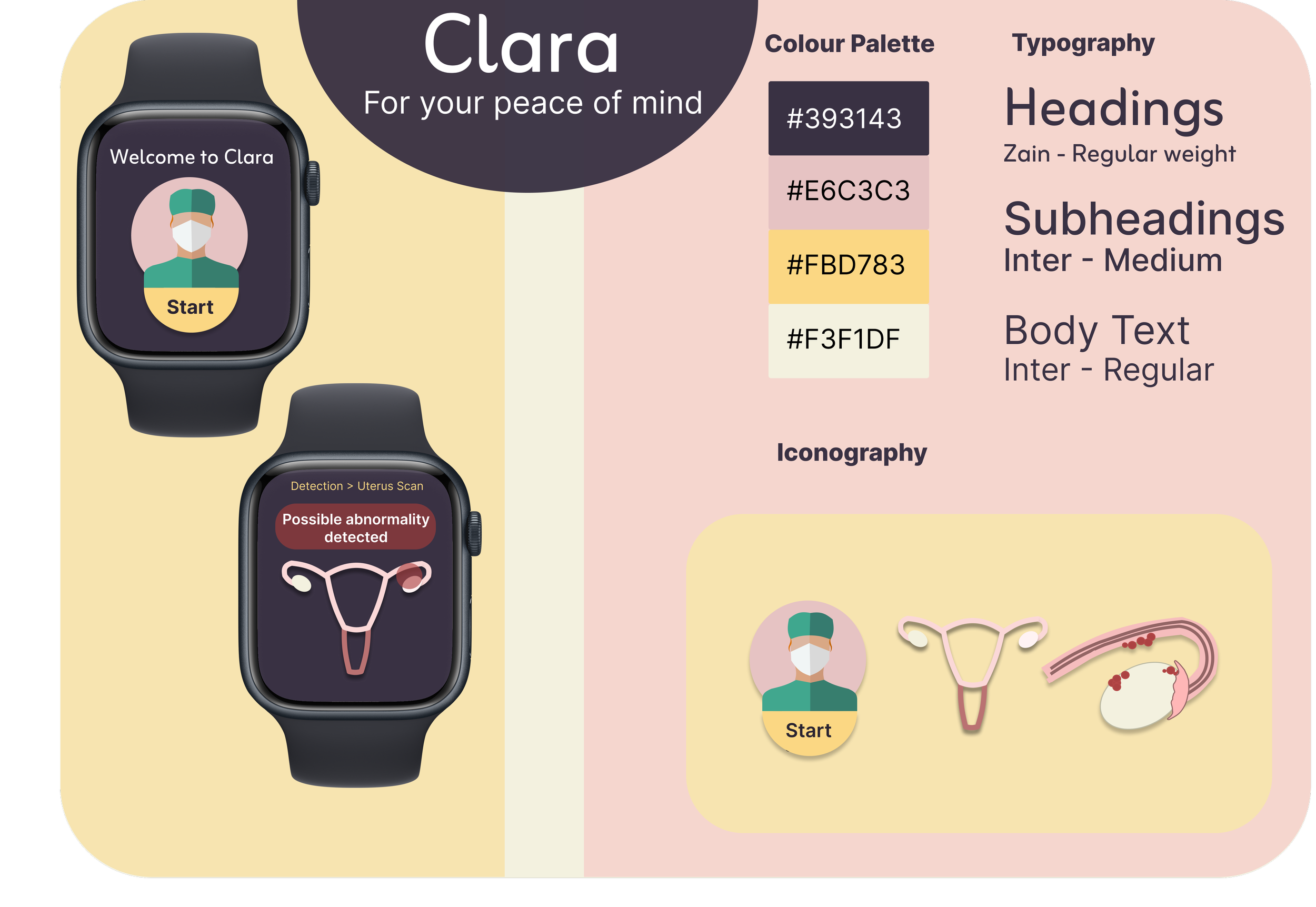 I predominantly used circular forms of icons as this conveys a wholeness, continuity and gentle aesthetic - reassuring users. Supporting the sensitive topic, making the design softer without compromising on effective ui design. Mini Brand Guidelines